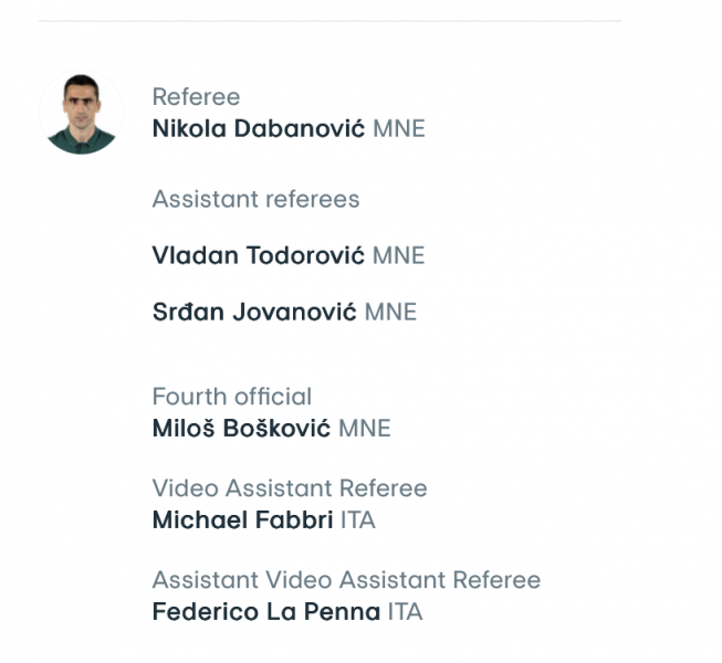 Βοηθοί οι συμπατριώτες του Τοντόροβιτς και Γιοβάνοβιτς, τέταρτος ο Μπόσκοβιτς και στο VAR ο επίσης γνώρισμος Ιταλός Μίκαελ Φάμπρι με AVAR τον Φεντερίκο Λα Πένα.